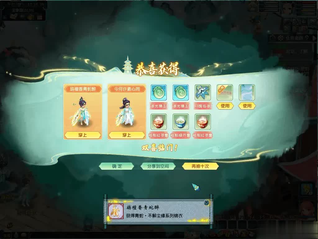 白娘子锦衣已在全服上线,小伙伴们都抽了吗?阿斧在这里分享一下自己的抽取情况,在第40抽获得了第一套锦衣,第90抽更是连中两套,除开其余杂七杂八的奖励,还有28点镜玉积分,凑够30分就能能换一个新出的武器装饰。值得一提的是,这次活动每次抽取只需要88点仙玉。如果喜欢本次联动锦衣,不妨也抽几手试试运气吧。