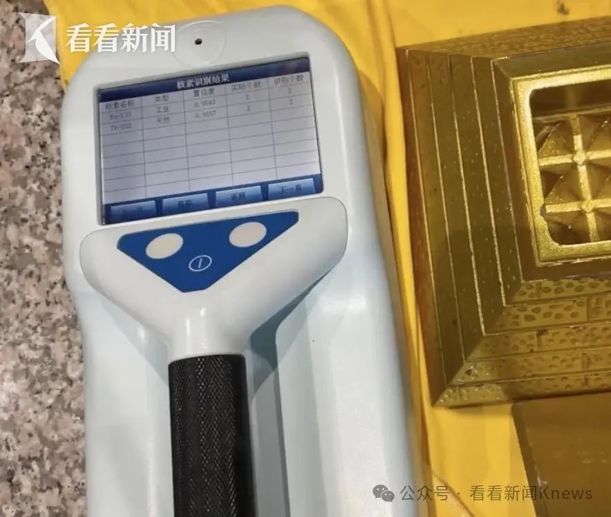 经手持式核素识别仪检测分析,该名旅客随身携带的金属材质、塔状物品“能量塔”的核辐射检测值严重超标,超出现场环境本底值的20倍,该物品含放射性核素钍-232、钡-133。